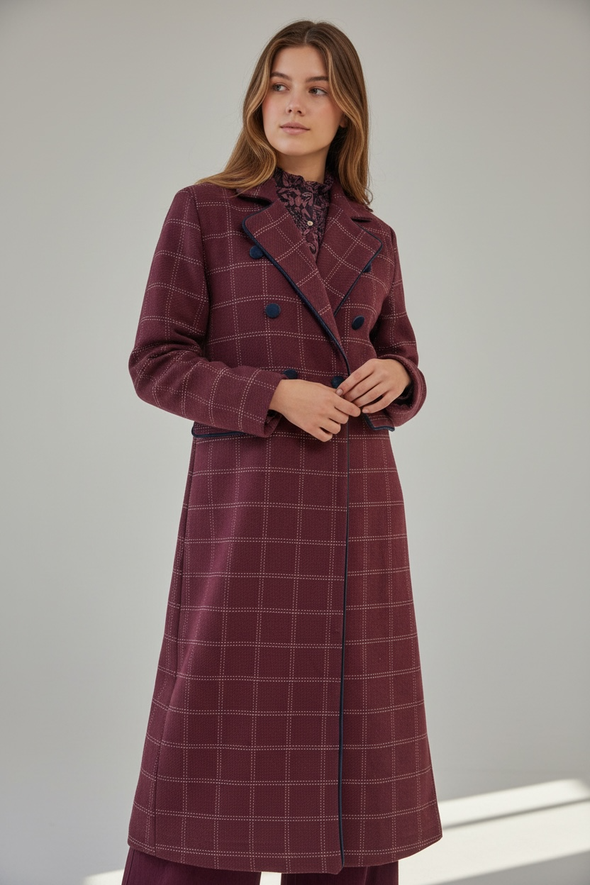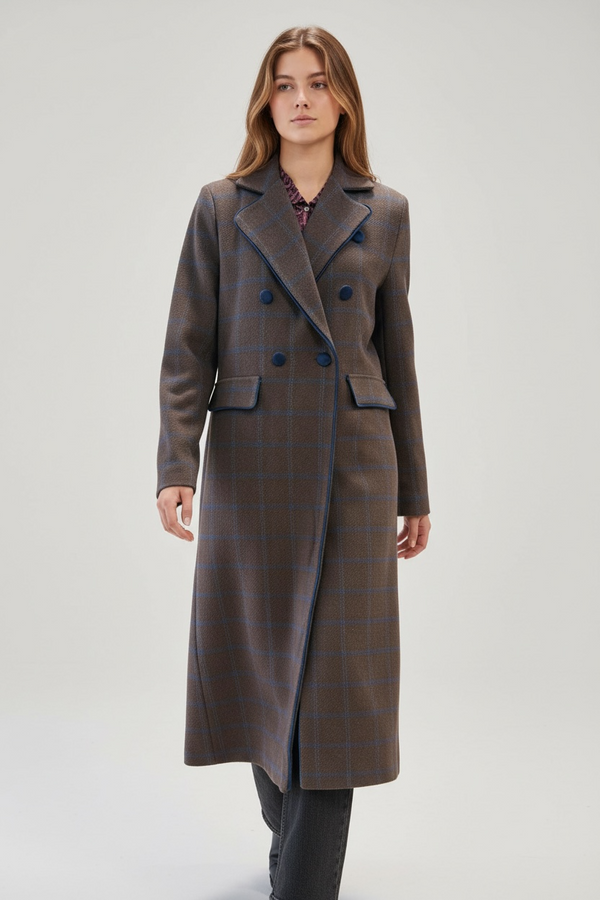Abrigo largo de doble botonadura con diseño de inspiración clásica y aire contemporáneo. Confeccionado en tejido de cuadros, aporta estructura y elegancia a cualquier look de otoño e invierno. Su silueta estiliza la figura, mientras que los detalles en contraste en solapas, bolsillos y botones elevan la prenda con un acabado exquisito.
