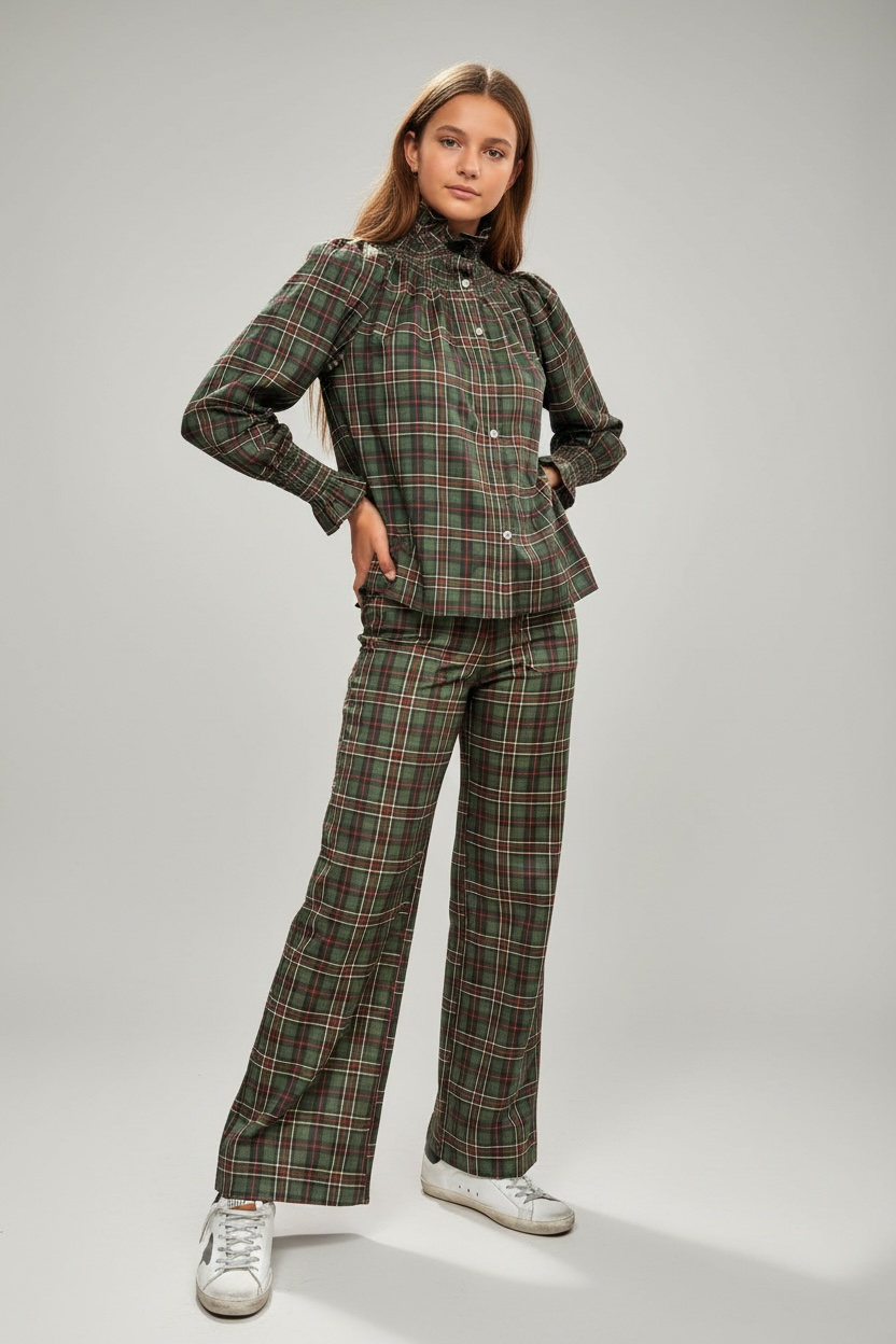 Blusa LÍA fruncida y de Cuadros destaca por su cuello fruncido con acabado elegante y su diseño femenino de inspiración clásica. Su corte fluido la convierte en una prenda muy cómoda y fácil de combinar tanto con vaqueros como con su pantalón a juego.