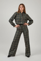 Este conjunto es pura personalidad. La blusa de rayas verticales en tonos azul petróleo y arena, con cuello subido y volante frontal, aporta un aire sofisticado y diferente, perfecto para quien busca prendas especiales. El pantalón a juego, de pierna ancha y caída fluida, estiliza y alarga la figura gracias a las rayas verticales, creando un look potente y súper armónico.