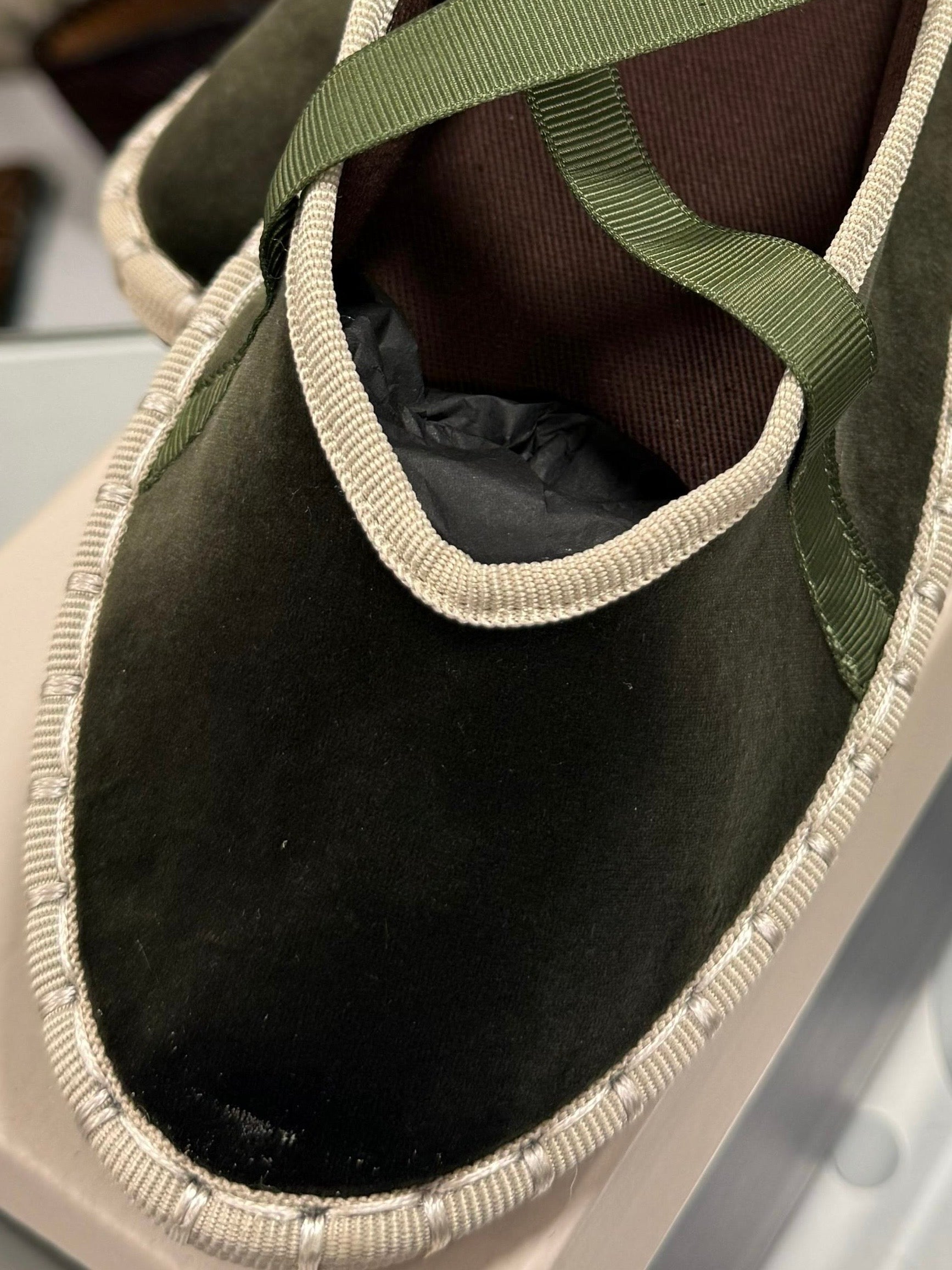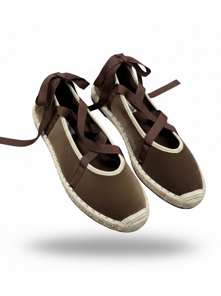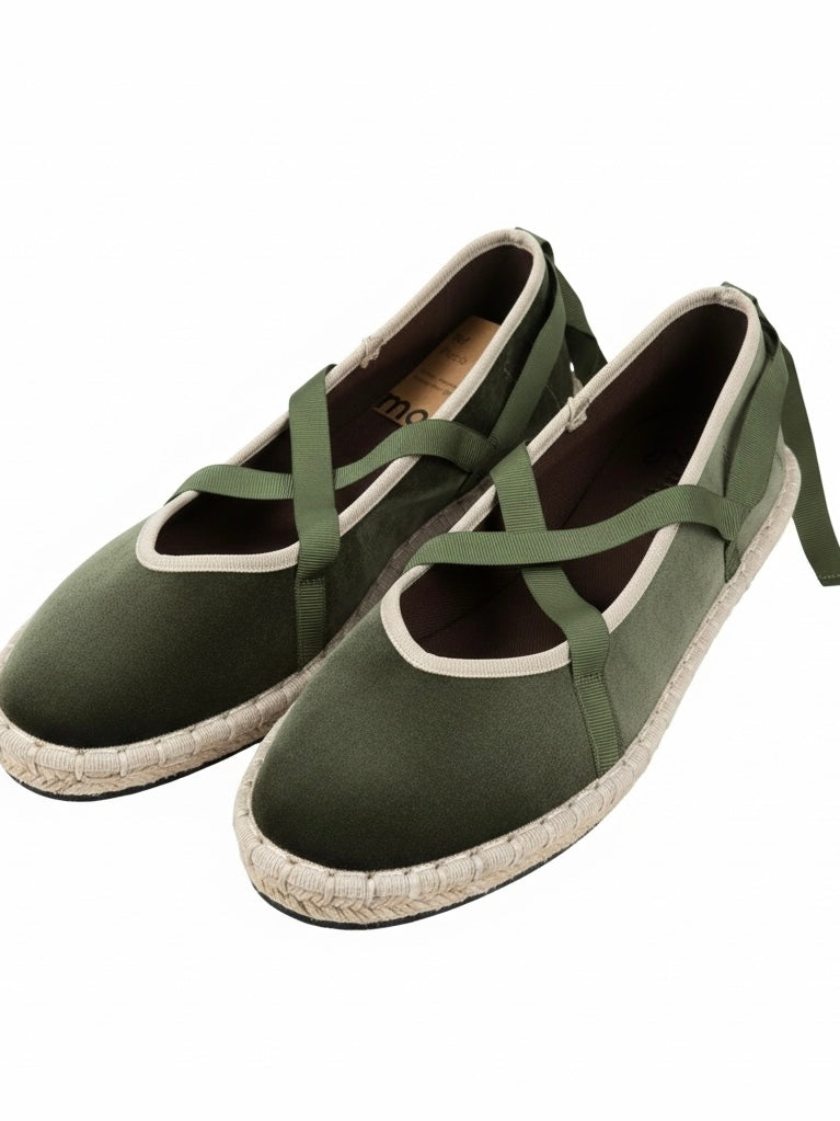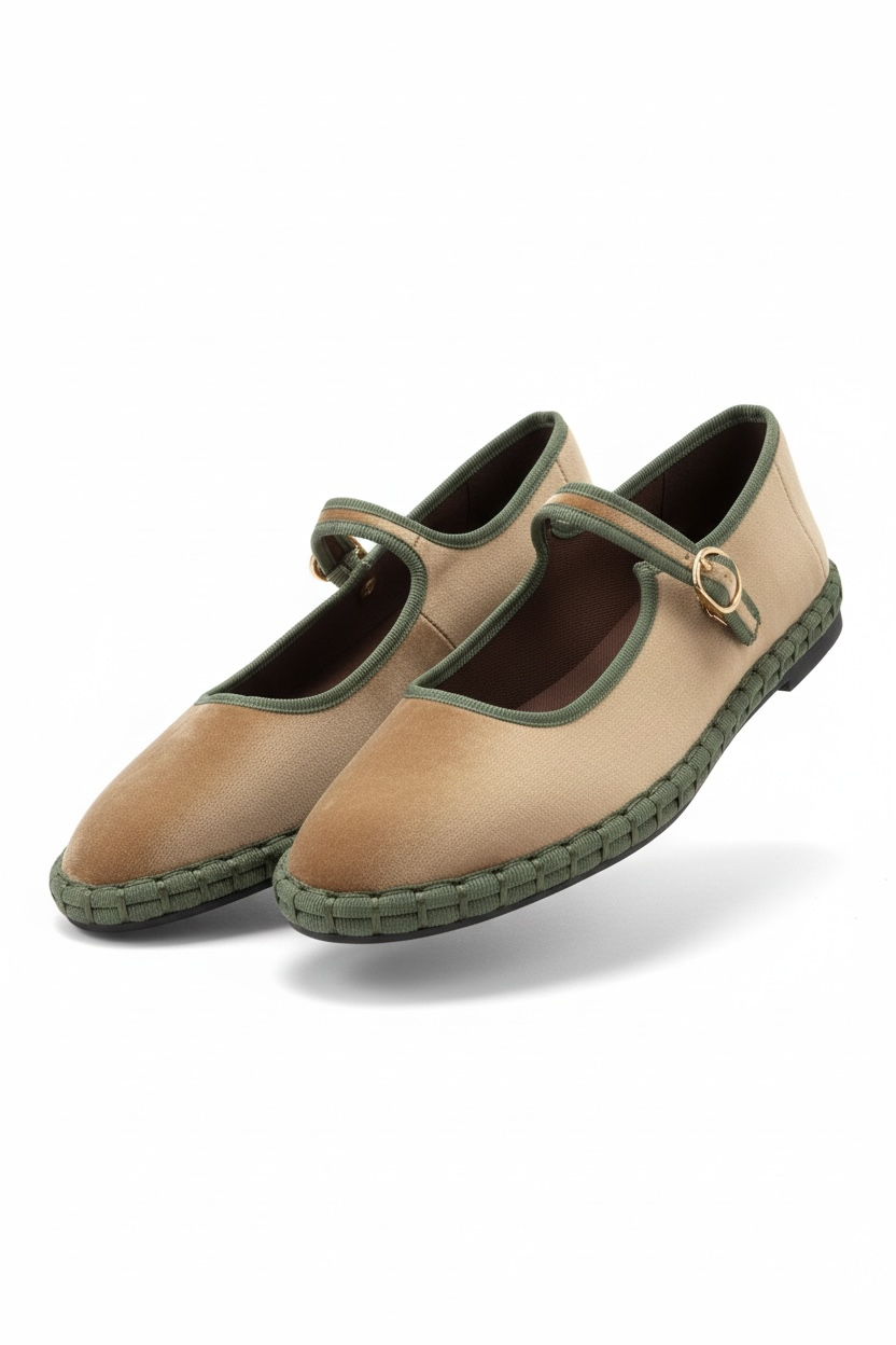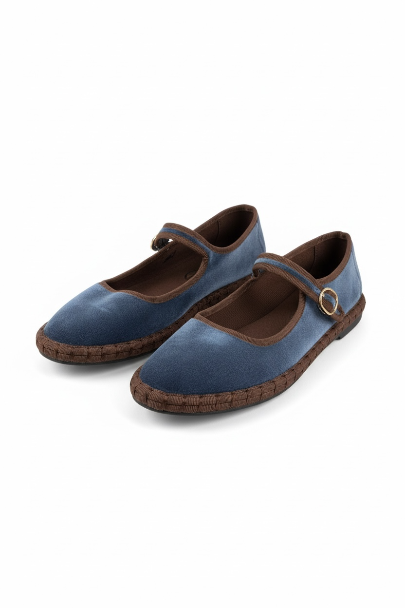Bailarina de terciopelo con suela tejida y cierre con cintas o hebilla. Suave, ligera y muy cómoda, perfecta para dar un toque especial a tus looks diarios con un aire artesanal y actual.