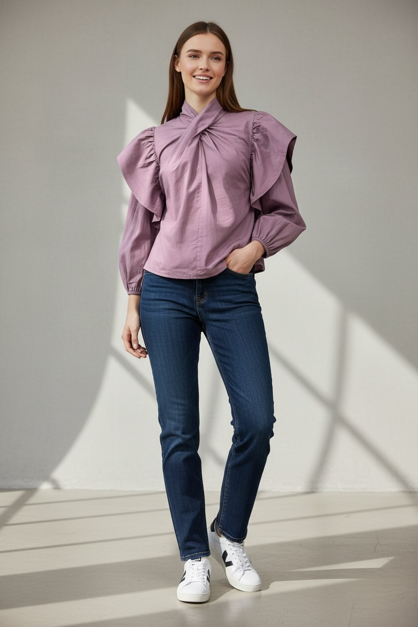 Blusa fluida con diseño cruzado en el delantero y volantes marcados en los hombros que aportan movimiento y estilo. Una prenda especial pero muy ponible, perfecta para elevar un look diario sin complicaciones.