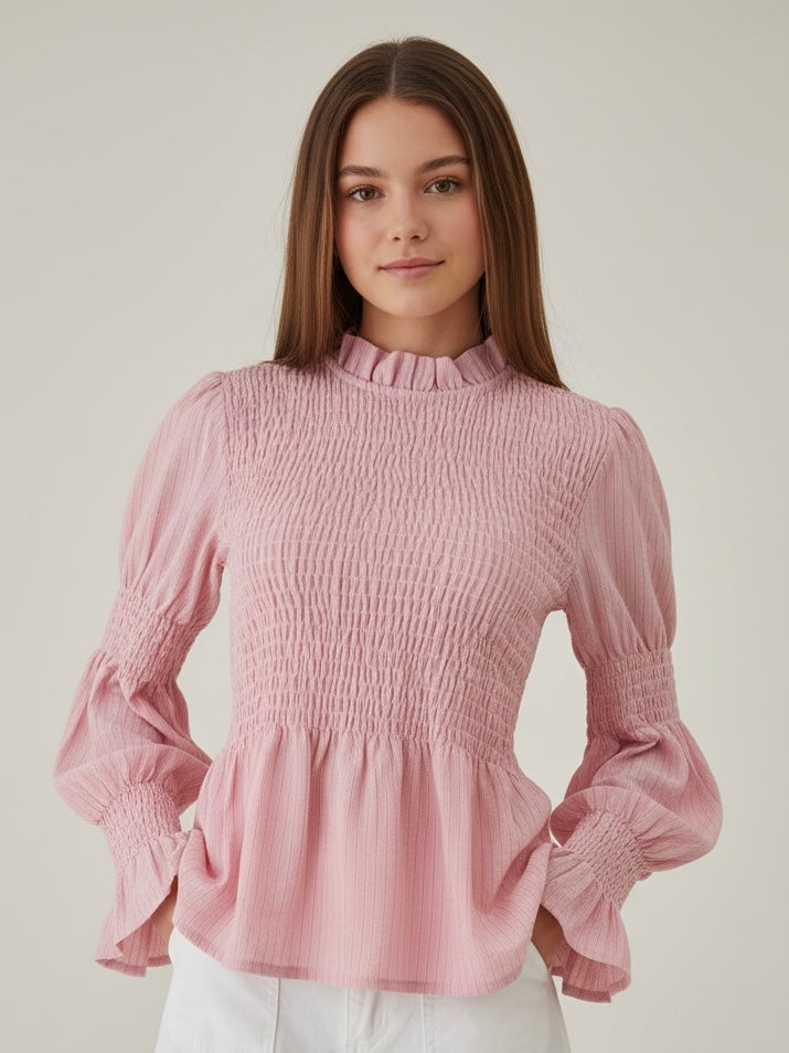 • Detalles Románticos: Cuello alto tipo "mock neck" con acabado en volante y mangas abullonadas estilo poeta.