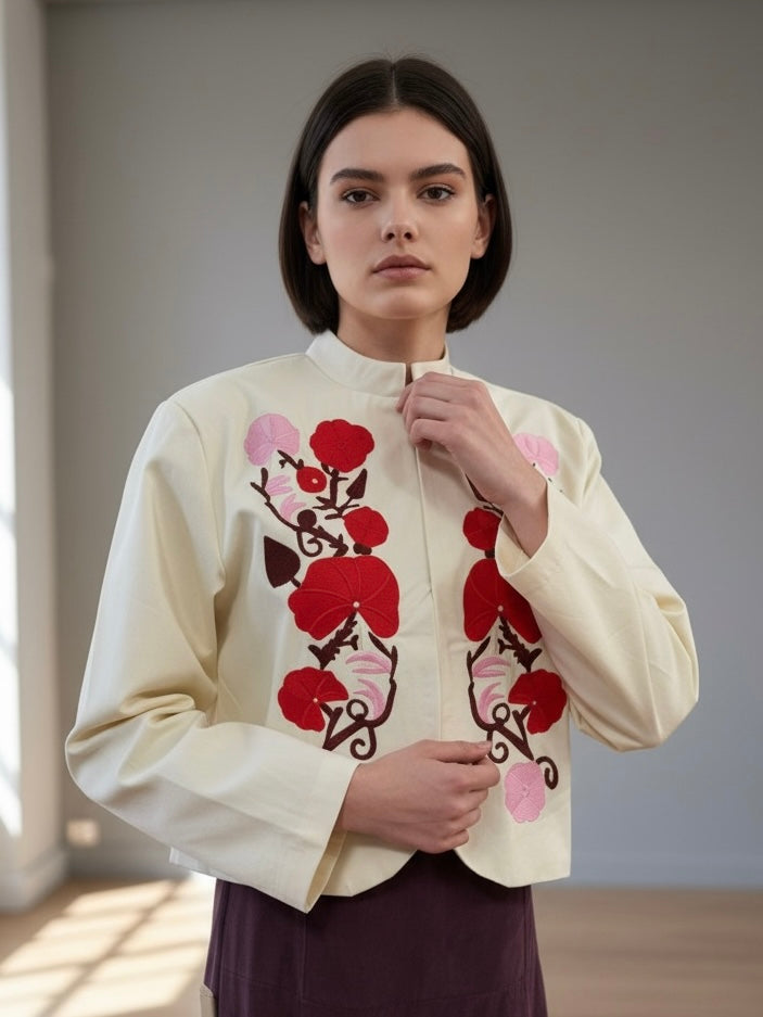 Chaqueta corta de inspiración artística que combina estructura y delicadeza a través de su bordado floral frontal. Una pieza especial que eleva cualquier look con un aire sofisticado y contemporáneo, perfecta para combinar tanto con faldas fluidas como con pantalones de corte limpio.