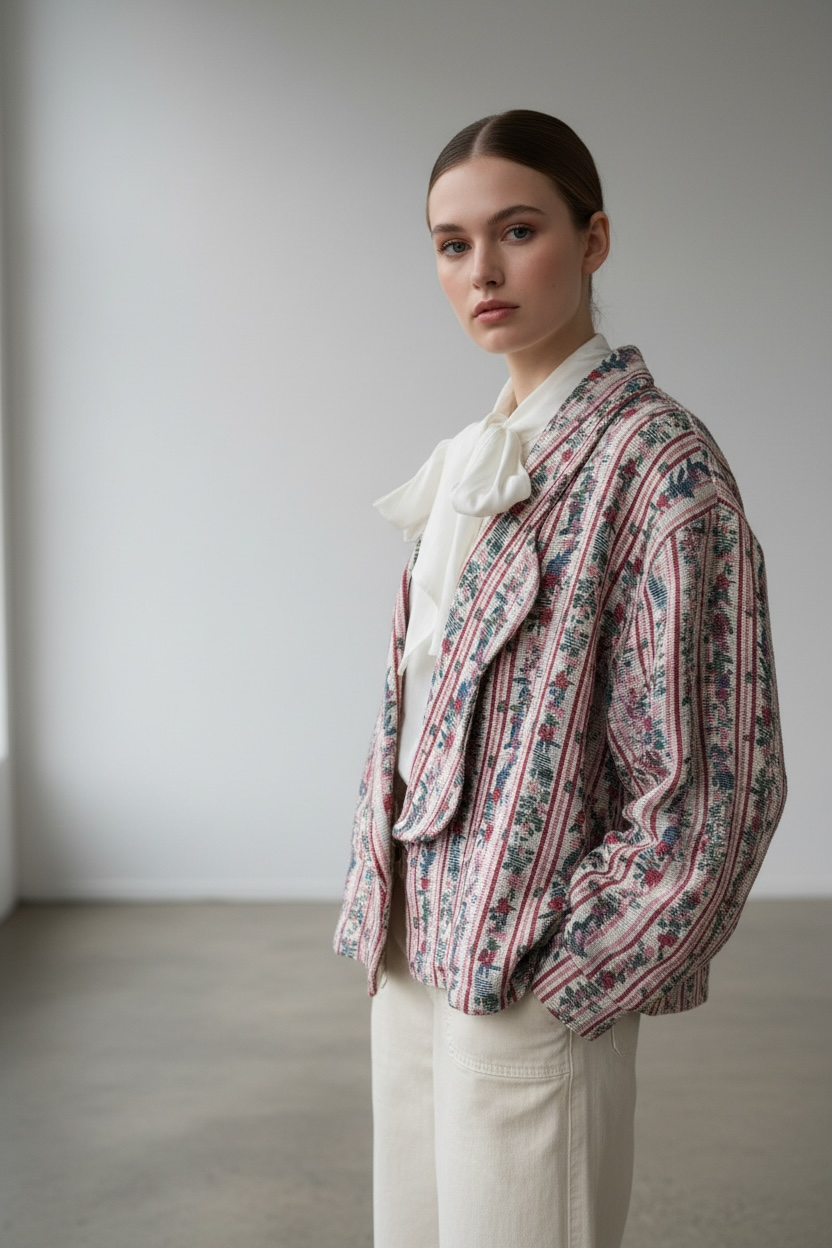 Chaqueta corta en tejido jacquard bordado artístico que aporta personalidad y sofisticación a cualquier look. Su corte relajado y el cuello envolvente crean una prenda especial, fácil de combinar y perfecta para elevar estilismos neutros con un toque distintivo y elegante.