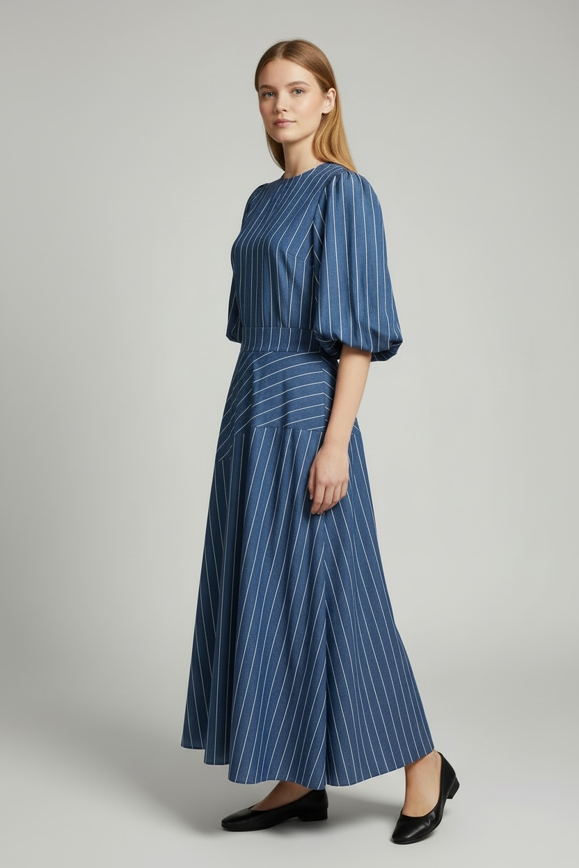 Conjunto de dos piezas, camisa y falda o pantalón, de inspiración contemporánea que combina elegancia y comodidad en una silueta limpia y favorecedora. El tejido de raya fina estiliza la figura mientras el diseño estructurado de la parte superior aporta un aire sofisticado y actual. Disponible con falda midi fluida o pantalón de pierna ancha para adaptarse a distintos estilos y momentos del día.