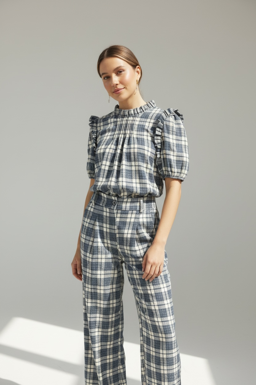 La blusa destaca por su cuello ligeramente fruncido y volante en los hombros, que aporta estructura y feminidad. El pantalón palazzo estiliza la figura gracias a su tiro alto y cinturón integrado, marcando cintura y alargando visualmente la silueta.