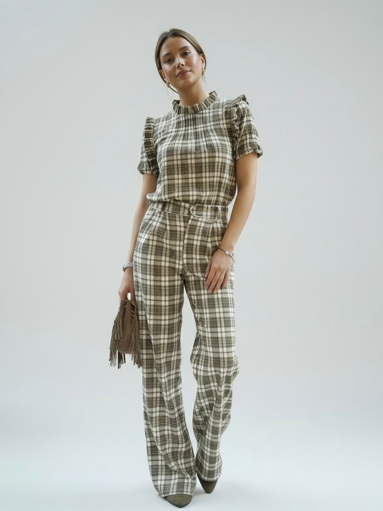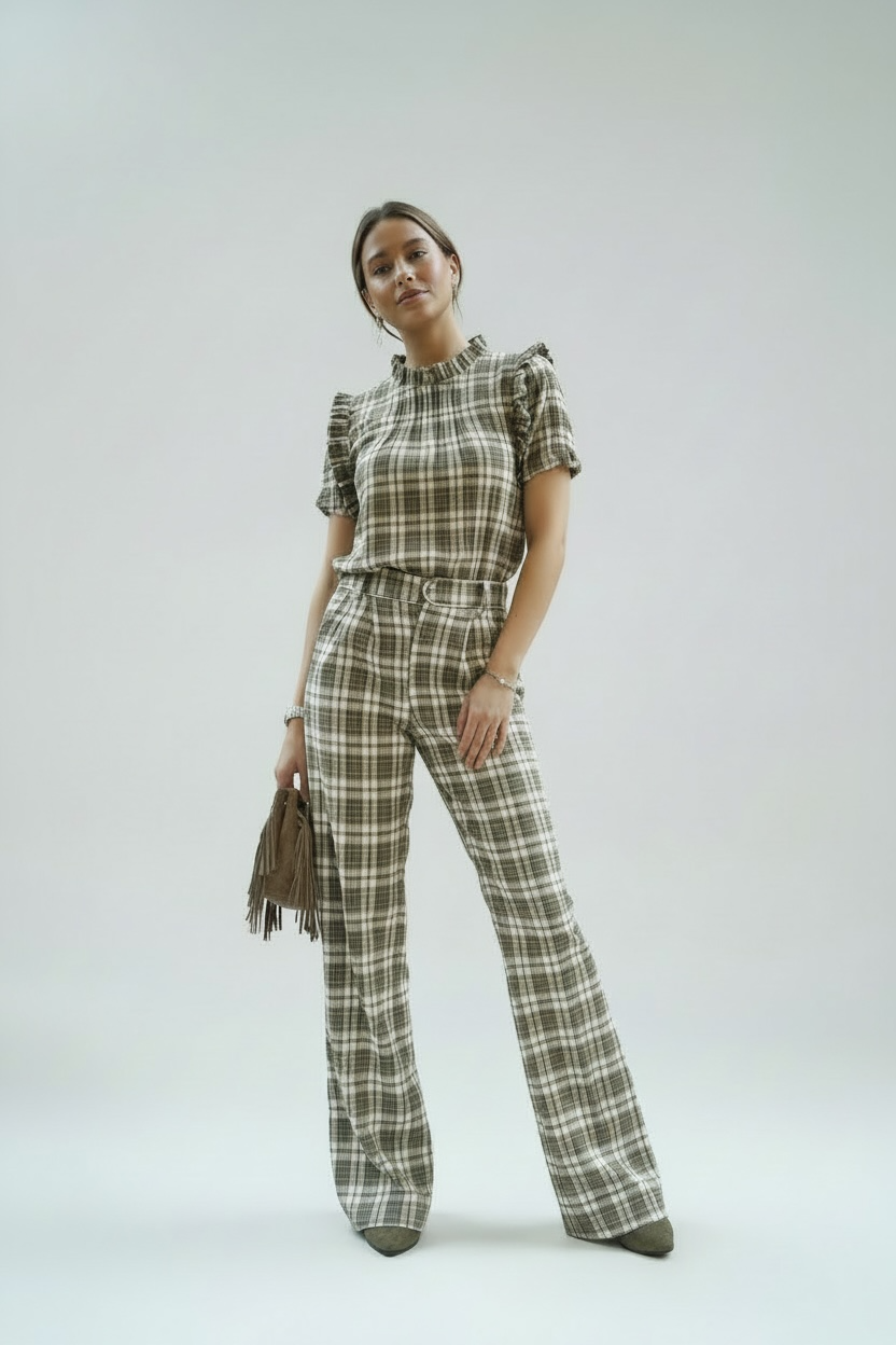 El Conjunto Cuadros Terral es una apuesta segura para quienes buscan un estilismo con carácter y estilo propio. Su estampado en tonos neutros tierra aporta calidez y versatilidad, ideal para invierno - primavera y perfecto para combinar con botas, stilettos o incluso zapatillas para un aire más relajado.