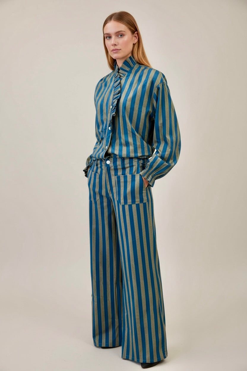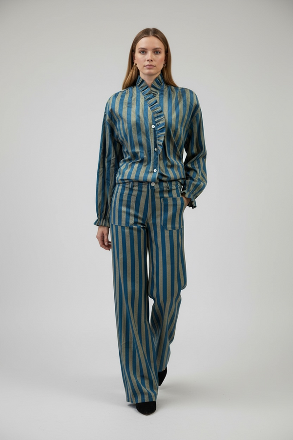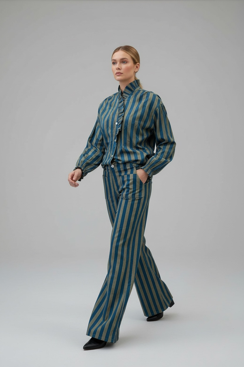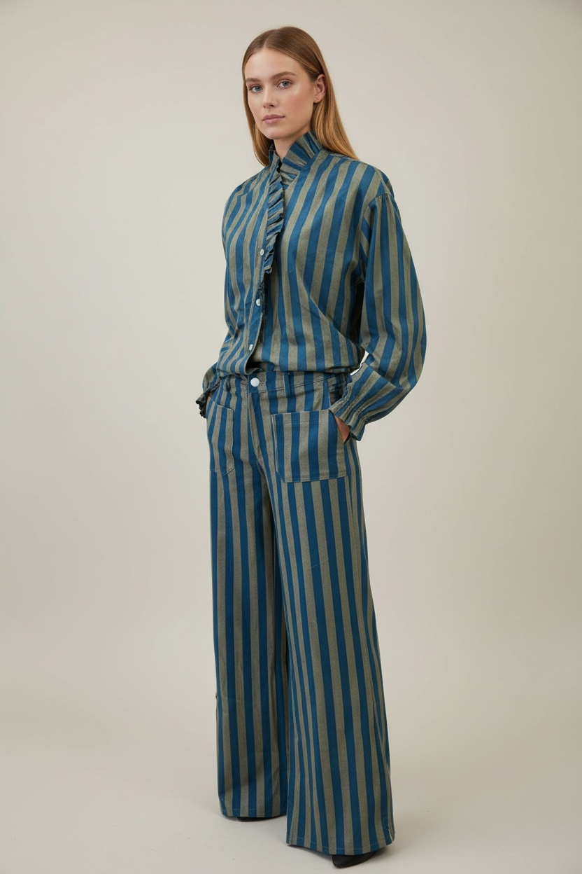 Este conjunto es pura personalidad. La blusa de rayas verticales en tonos azul petróleo y arena, con cuello subido y volante frontal, aporta un aire sofisticado y diferente, perfecto para quien busca prendas especiales. El pantalón a juego, de pierna ancha y caída fluida, estiliza y alarga la figura gracias a las rayas verticales, creando un look potente y súper armónico.