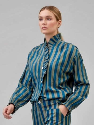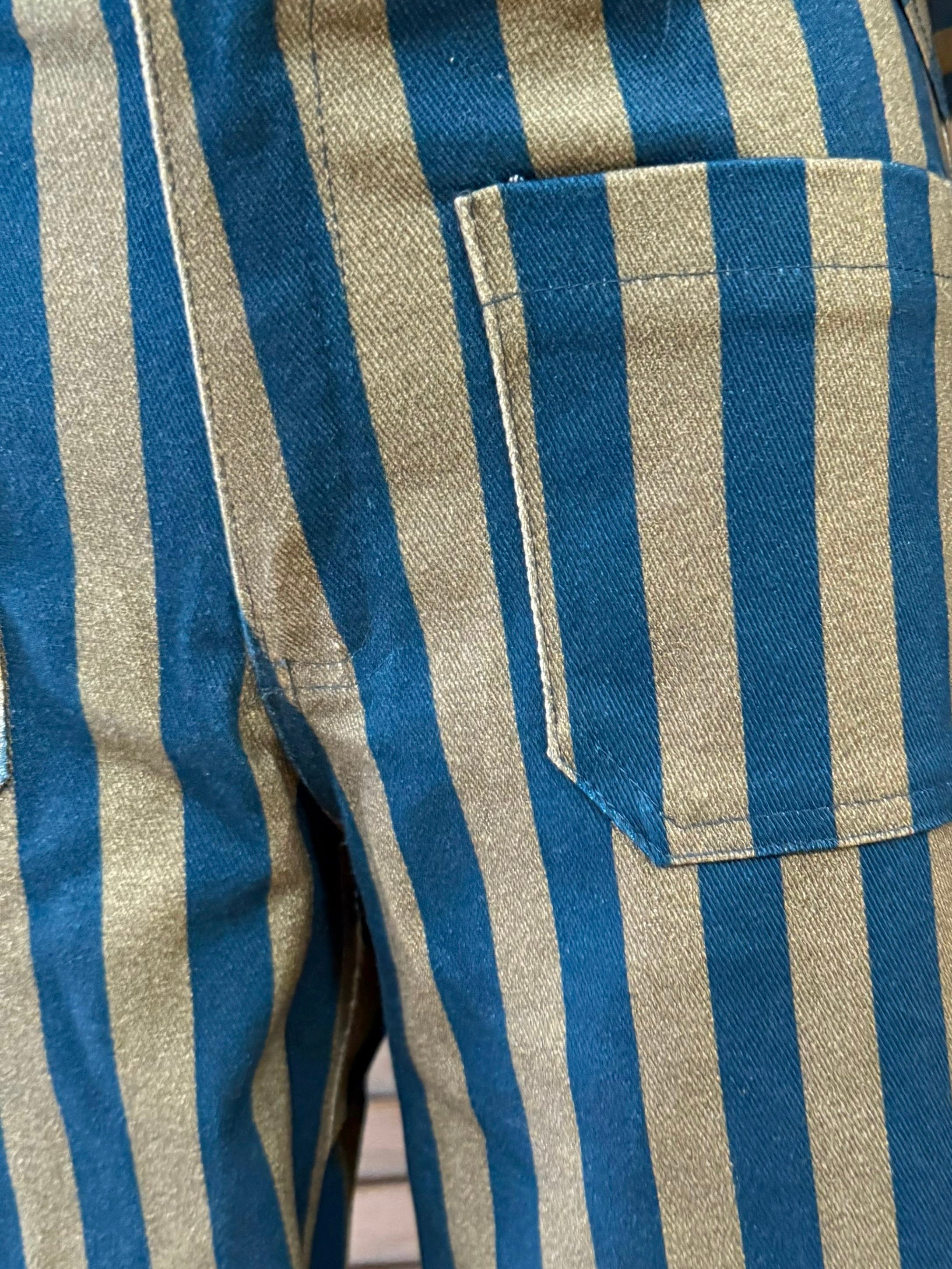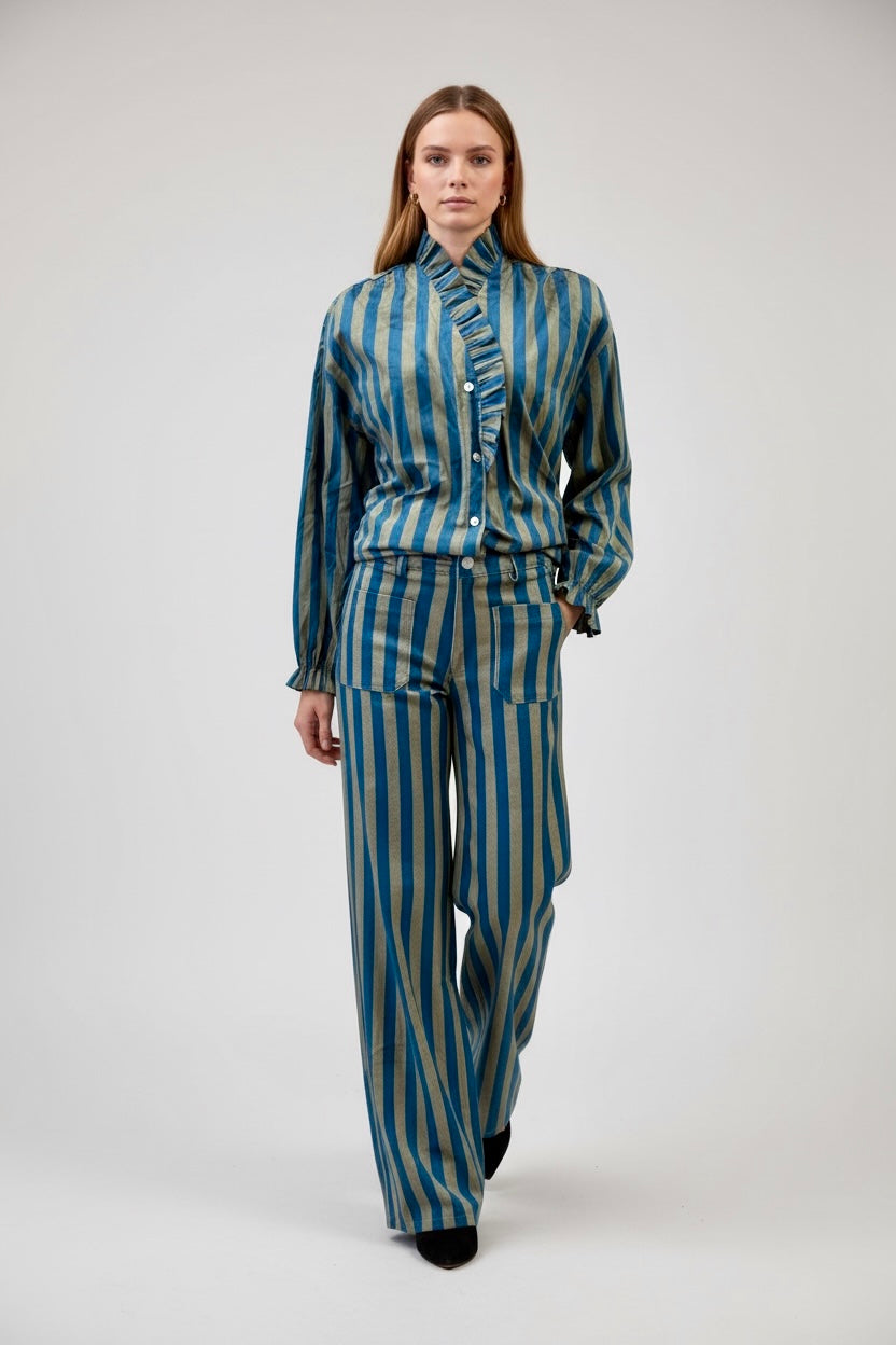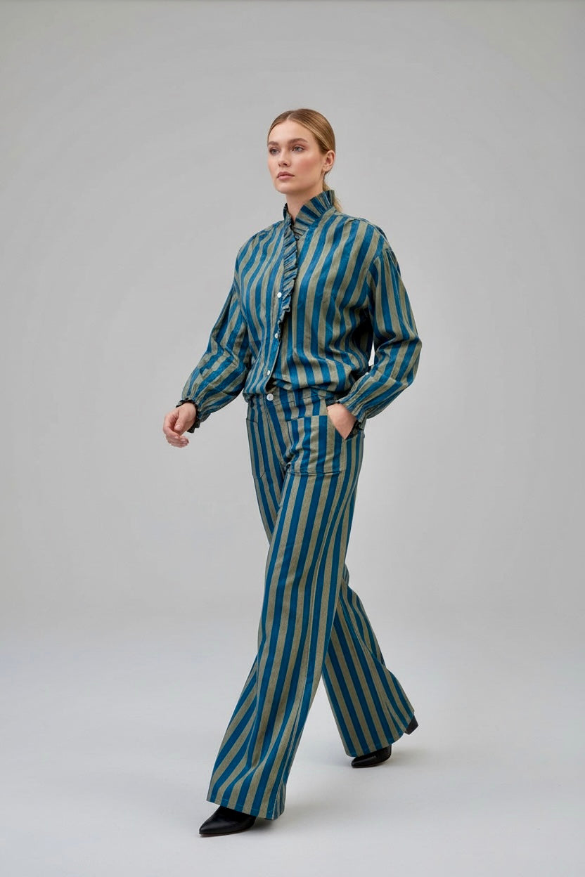 Este conjunto es pura personalidad. La blusa de rayas verticales en tonos azul petróleo y arena, con cuello subido y volante frontal, aporta un aire sofisticado y diferente, perfecto para quien busca prendas especiales. El pantalón a juego, de pierna ancha y caída fluida, estiliza y alarga la figura gracias a las rayas verticales, creando un look potente y súper armónico.