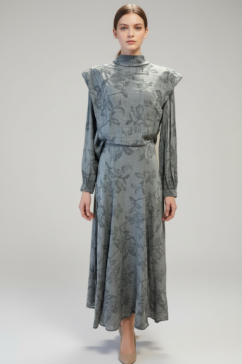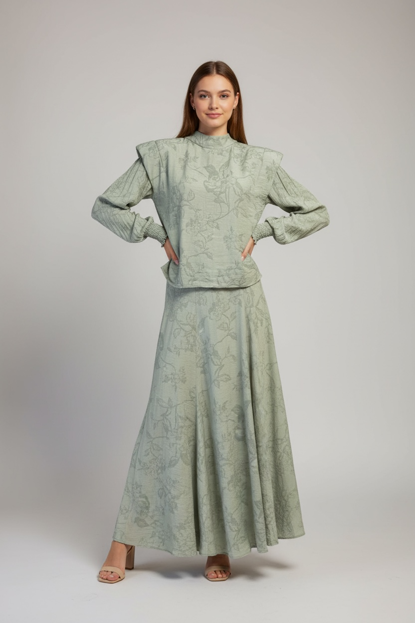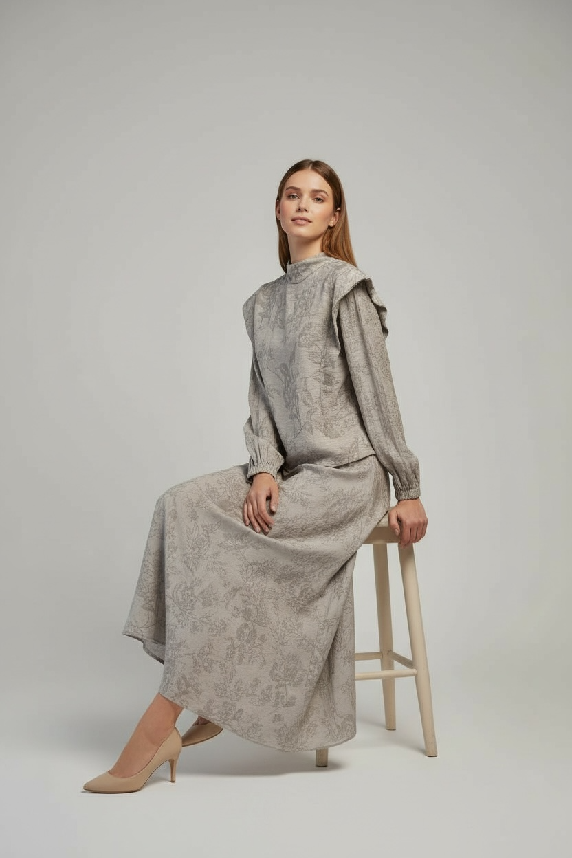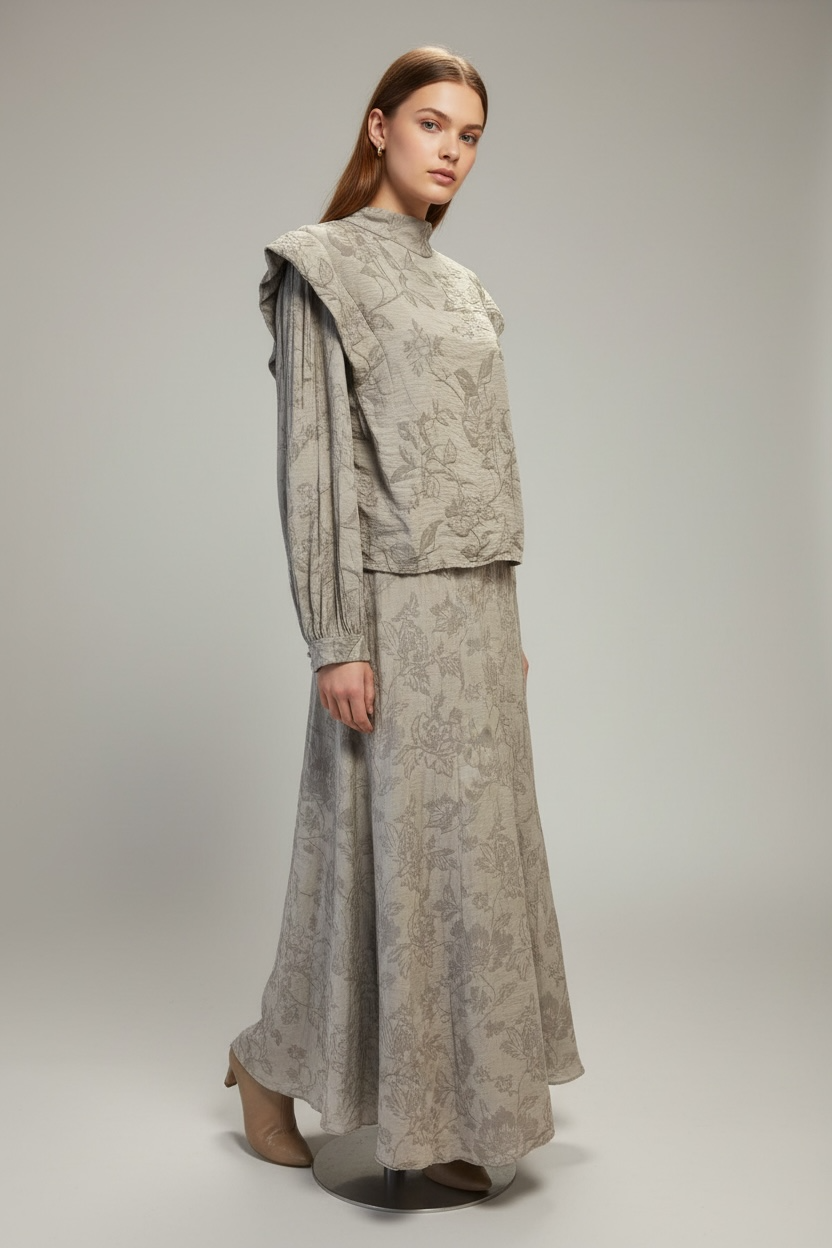 Un coordinado compuesto por una blusa de cuello alto y una falda larga acampanada, confeccionado en un tejido con relieve y estampado floral damasco en tono malva. Destaca por su equilibrio entre la feminidad del diseño y la sobriedad de su estructura.