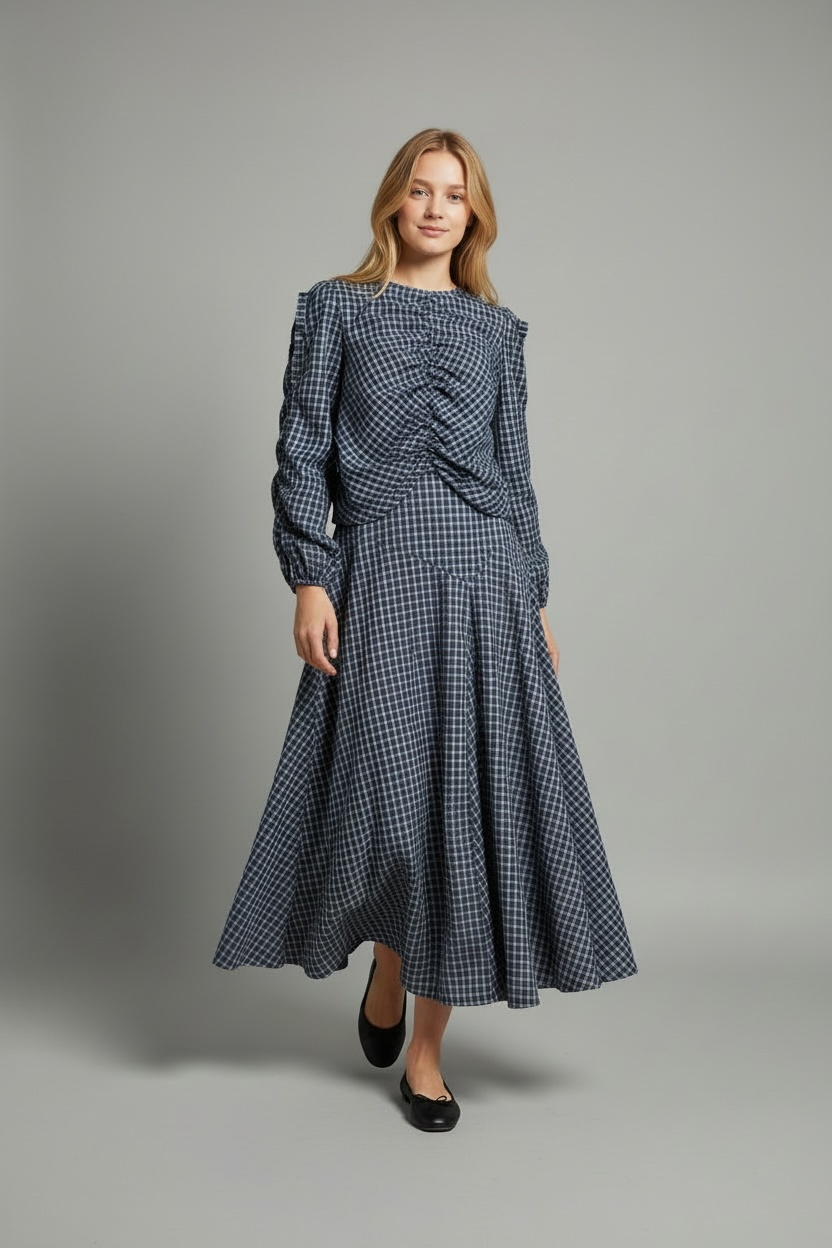 Un conjunto que combina elegancia relajada y aire contemporáneo. El estampado cuadros en tonos gris azulado aporta un toque atemporal, mientras que el fruncido frontal del top estiliza la silueta y añade movimiento. La falda midi de caída fluida acompaña cada paso con naturalidad, creando un look cómodo, femenino y muy versátil. Perfecto para el día a día con bailarinas o para elevarlo con botines o tacón suave.