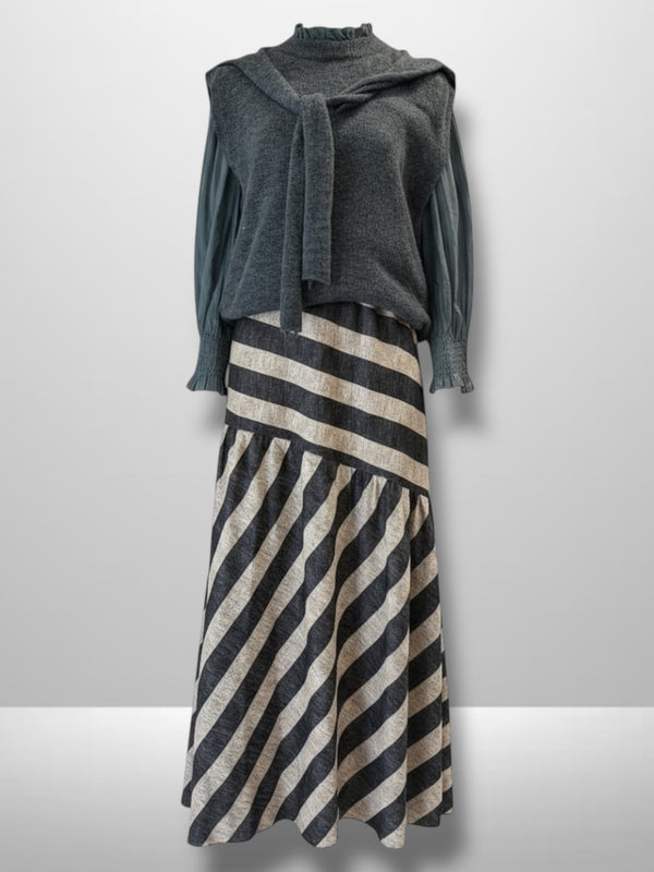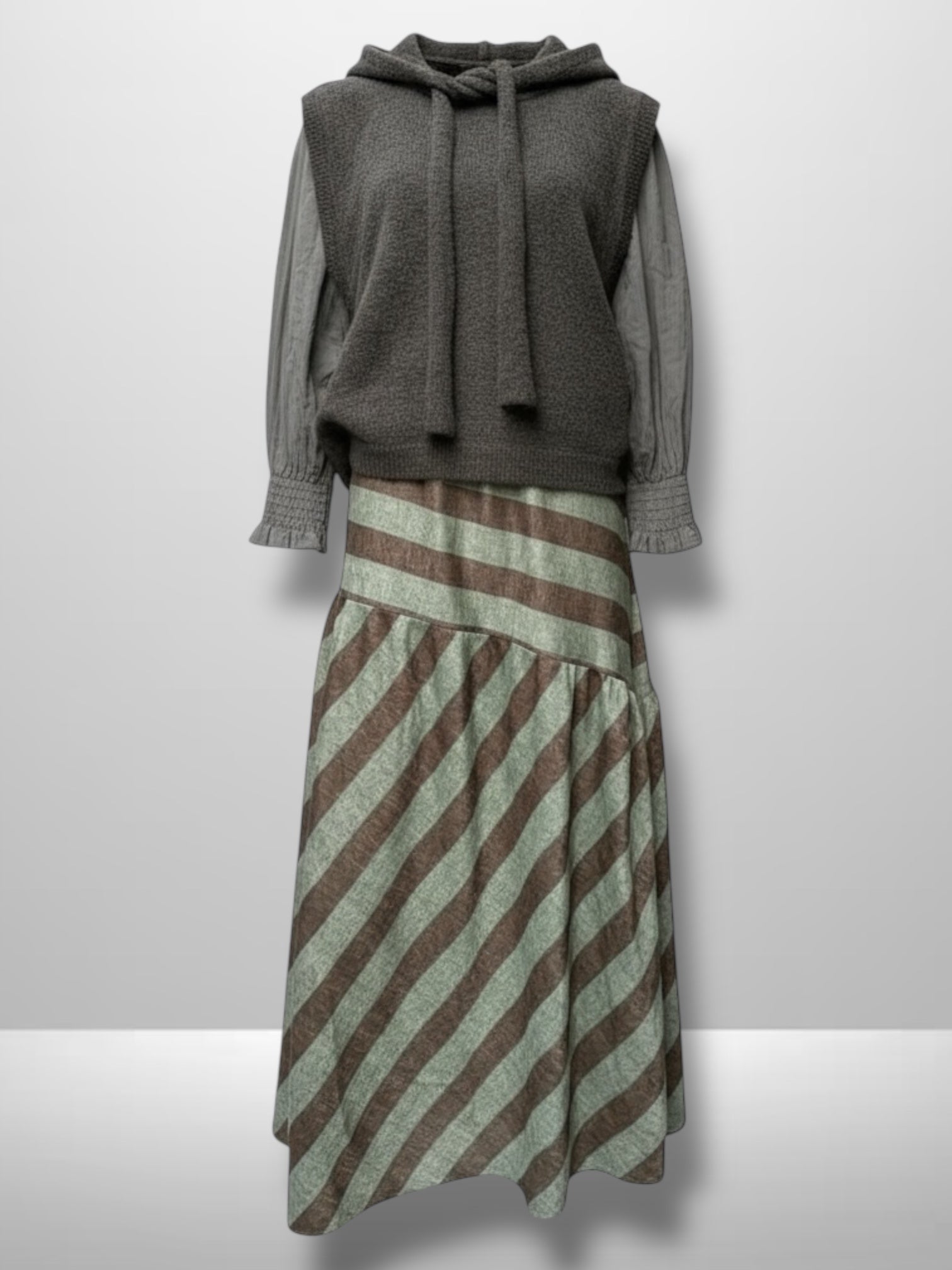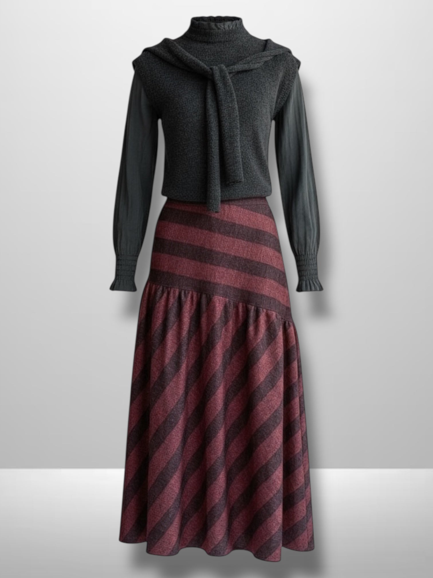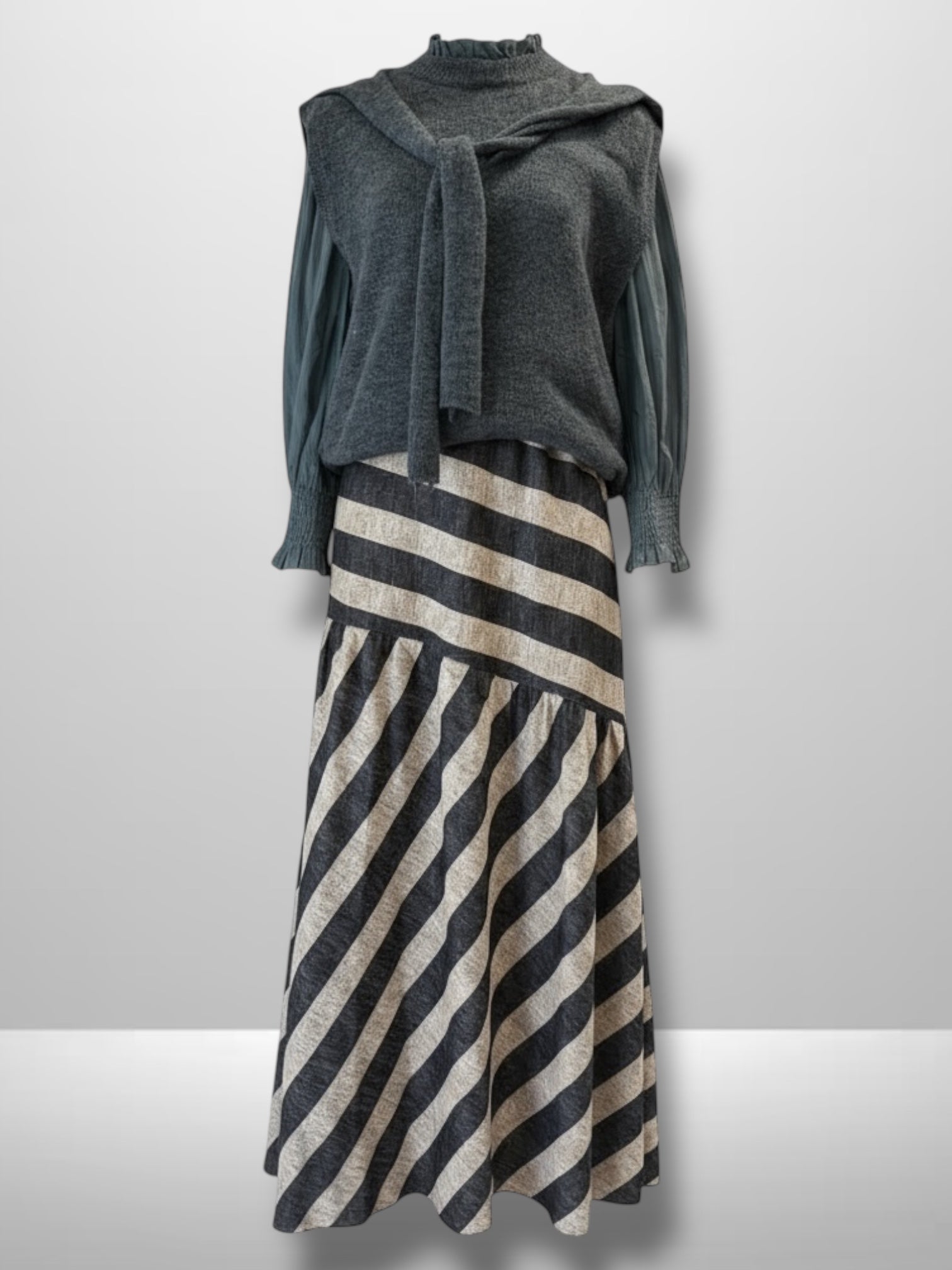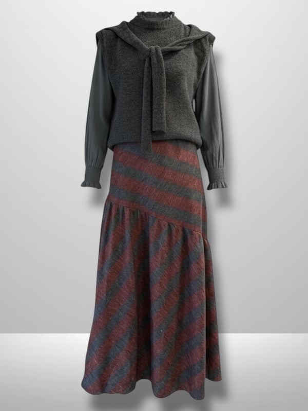 Falda midi-larga confeccionada en punto suave con caída fluida. Presenta un diseño con paneles diagonales que crean un efecto visual estilizador. Cintura ajustada sin costuras visibles y ligero volumen en el bajo para aportar movimiento. Perfecta para combinar con jerséis gruesos o camisas ligeras en los meses fríos.