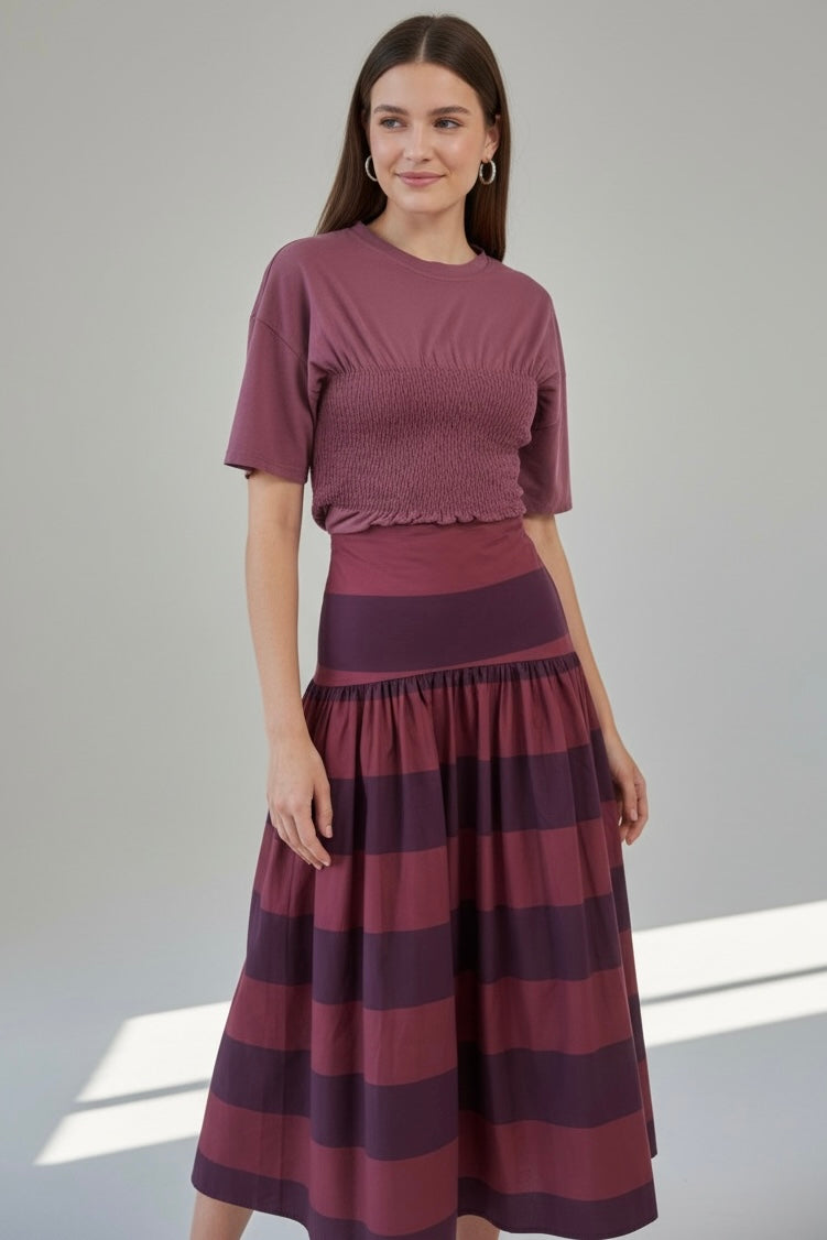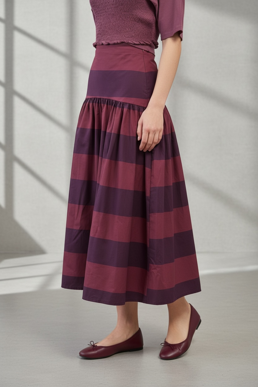 Falda midi de volumen suave con diseño de rayas en tonos burdeos y granate. Su cintura alta estiliza la silueta mientras el vuelo natural aporta movimiento y elegancia a cada paso. Una prenda muy versátil que combina perfectamente con prendas de punto o camisetas para looks sofisticados de diario.