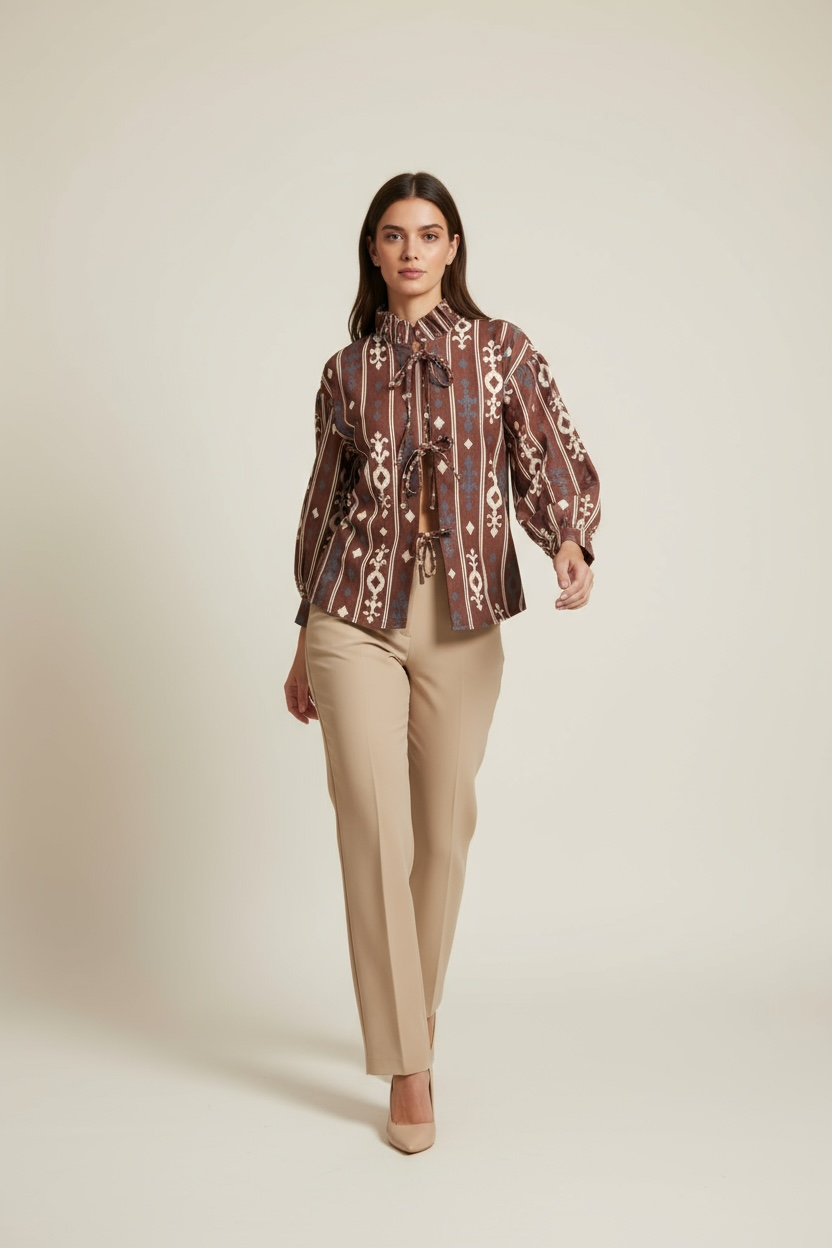 El estampado geométrico le da ese toque boho chic, las mangas abullonadas suman estilo sin esfuerzo y cierre con lazada es el detalle que la hace especial.