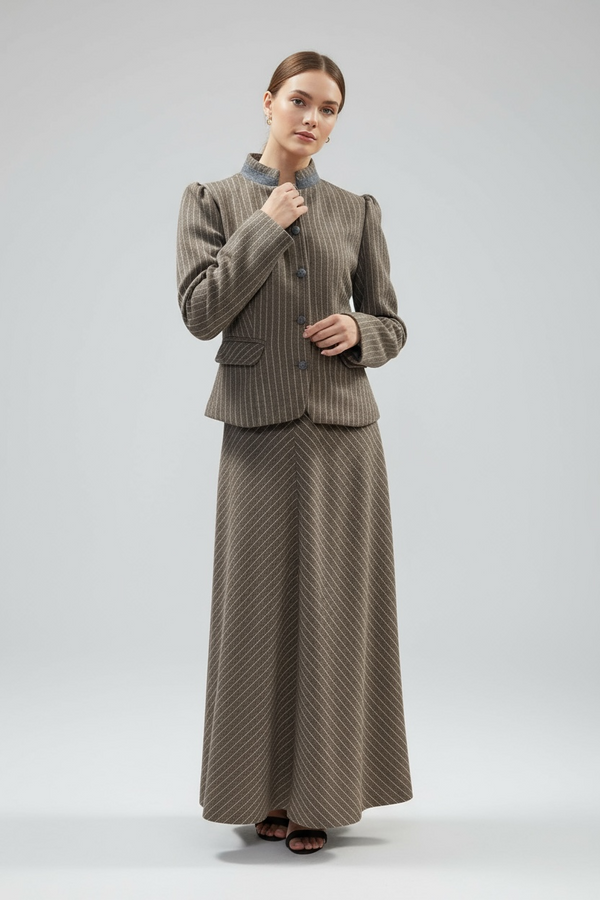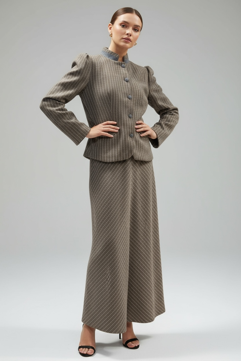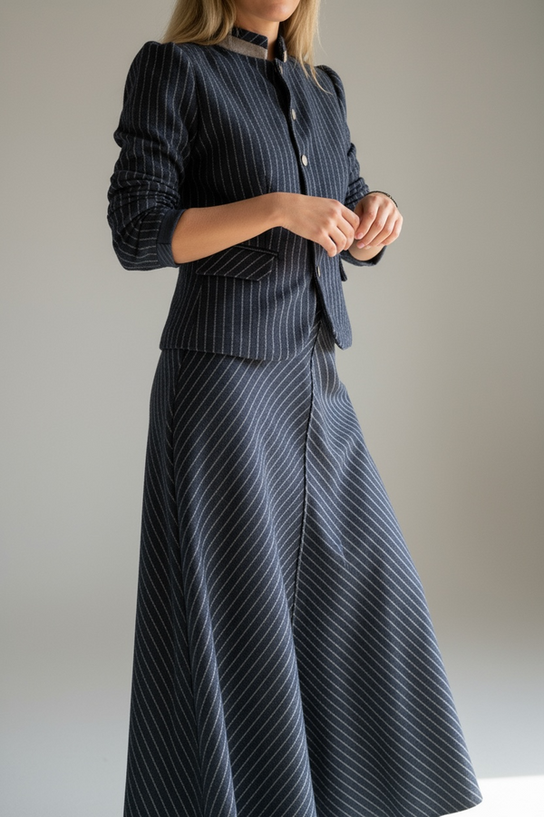 Este conjunto es ese “wow, qué elegante vas… pero sin esforzarte” que todas queremos en el armario. Chaqueta estructurada con un puntito vintage, falda larga con caída preciosa y un estampado de raya diplomática que estiliza que da gusto.