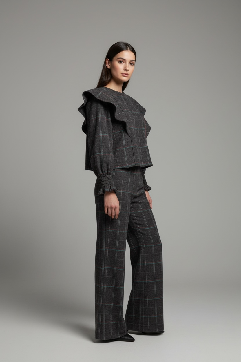Conjunto de dos piezas en tejido de cuadros con diseño elegante y actual. La blusa destaca por su volante estructurado en el hombro y mangas ligeramente abullonadas, que aportan un toque especial sin perder sobriedad. El pantalón de corte recto estiliza la pierna y equilibra el conjunto con una silueta cómoda y favorecedora. Ideal para llevar junto o por separado y crear looks de oficina, eventos informales o cenas.