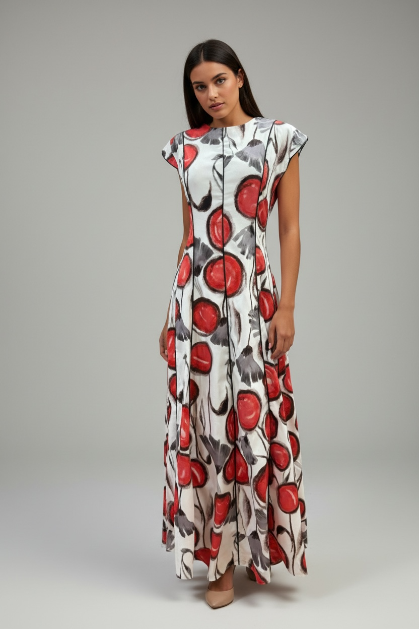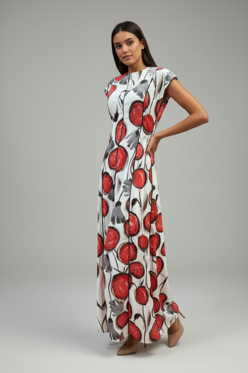 El Vestido Largo “Cerise” es una pieza con personalidad propia. Su corte limpio y vertical estiliza la figura, mientras el estampado pictórico aporta frescura y carácter.